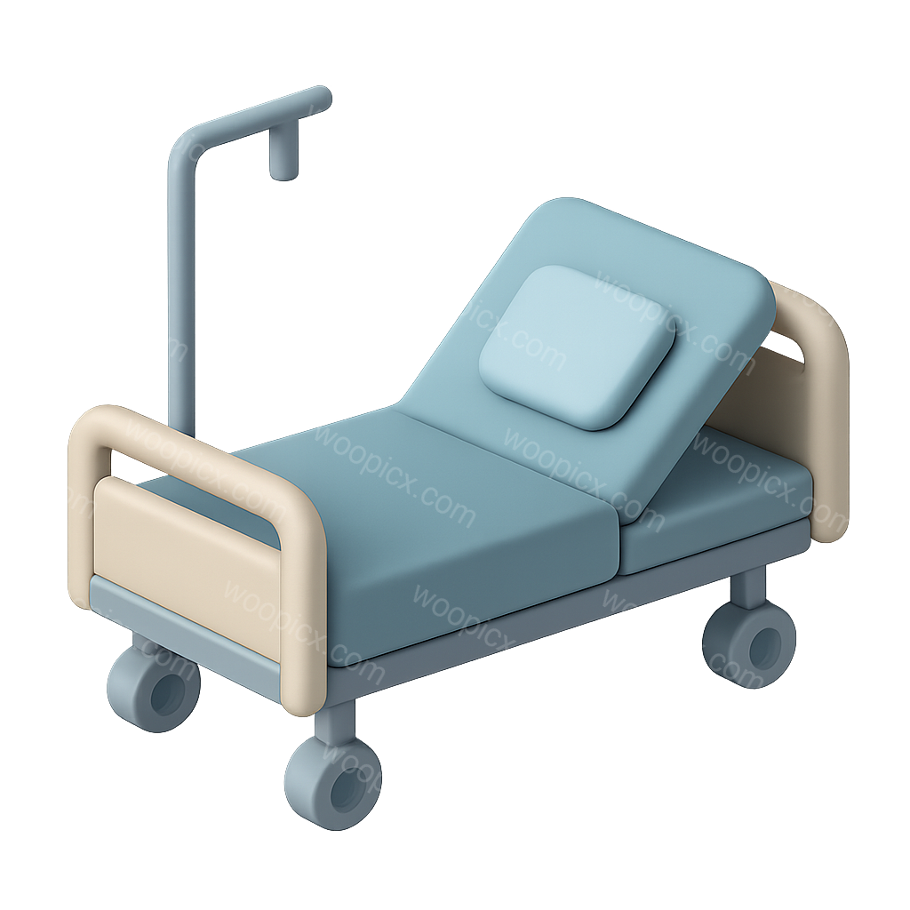 /Premium/Collection: /by davooda/Type: PNG/A stylized 3D icon of a hospital bed designed in an isometric view. The bed features a blue mattress, a pillow, and adjustable components, all set against a transparent background.