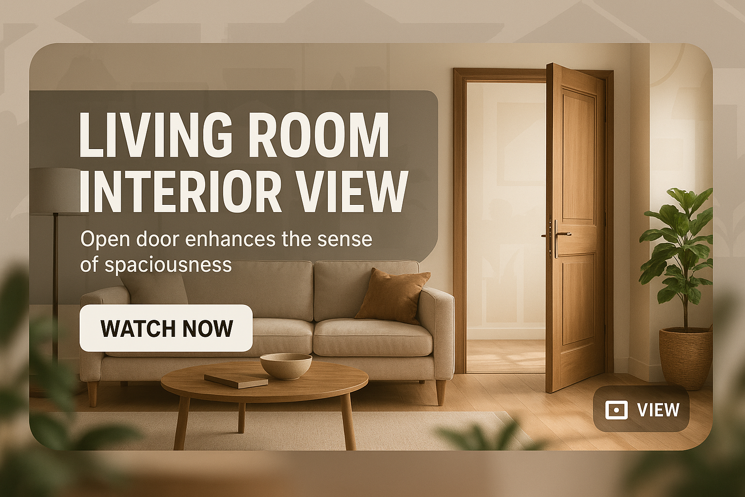 A visually appealing graphic showcasing a living room interior with an open door, enhancing the sense of space. Ideal for home decor promotion or interior design content.