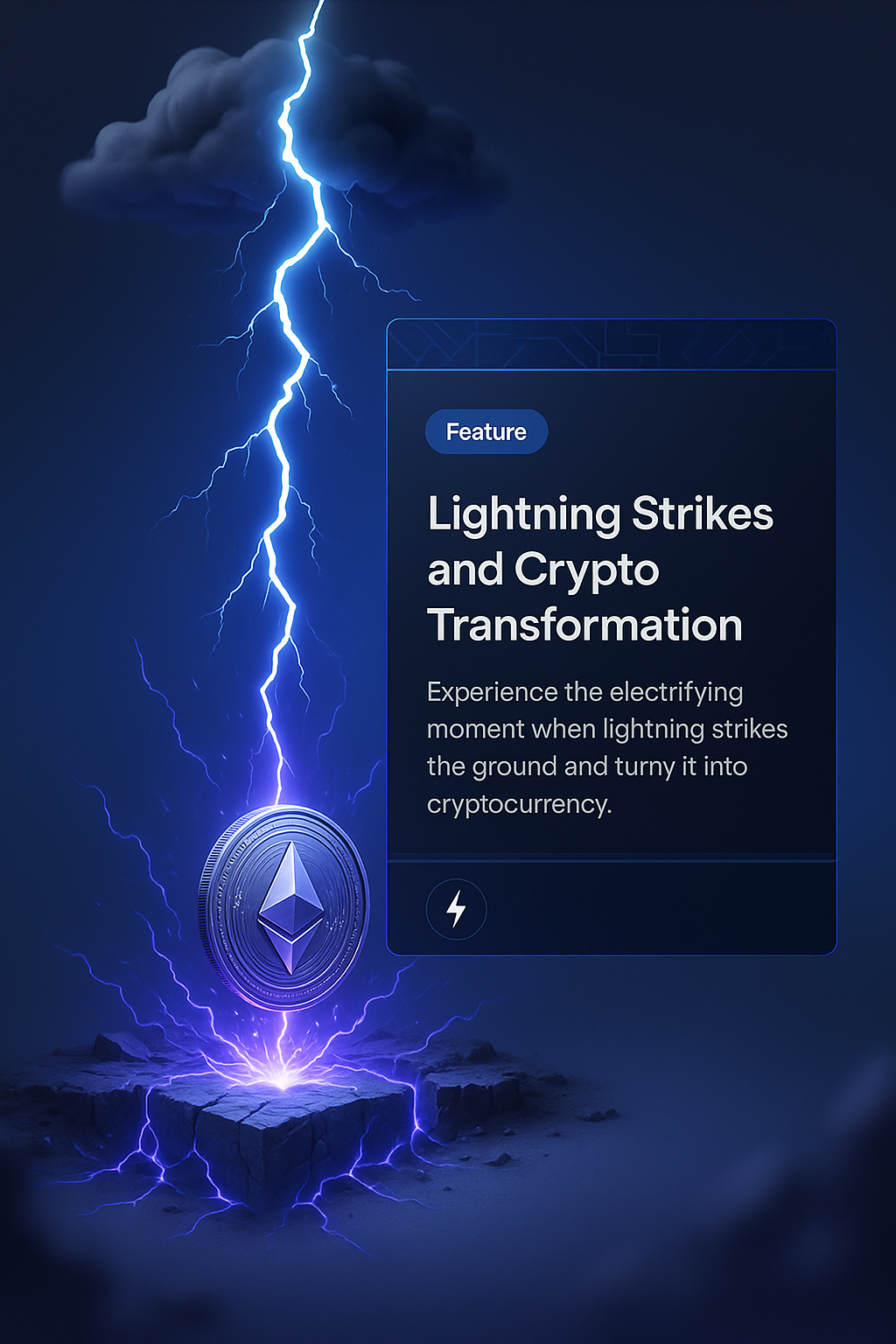/Collection: /by davooda/Type: PNG/A dynamic 3D illustration depicting a lightning strike transforming the ground into cryptocurrency. Features a gradient background and integrated text blocks highlighting the concept.