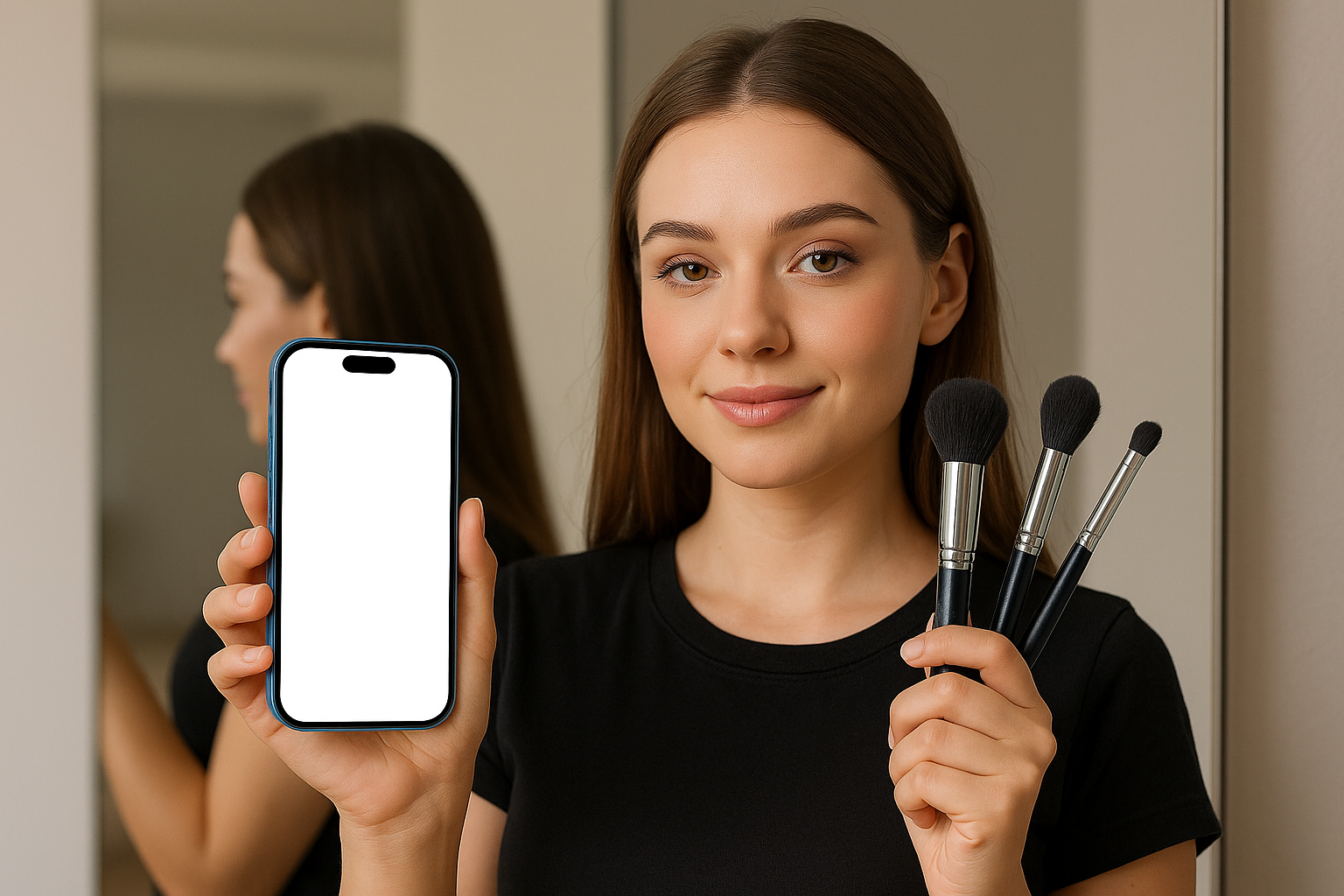 Makeup Artist Holding Phone and Brushes in Dynamic Shot