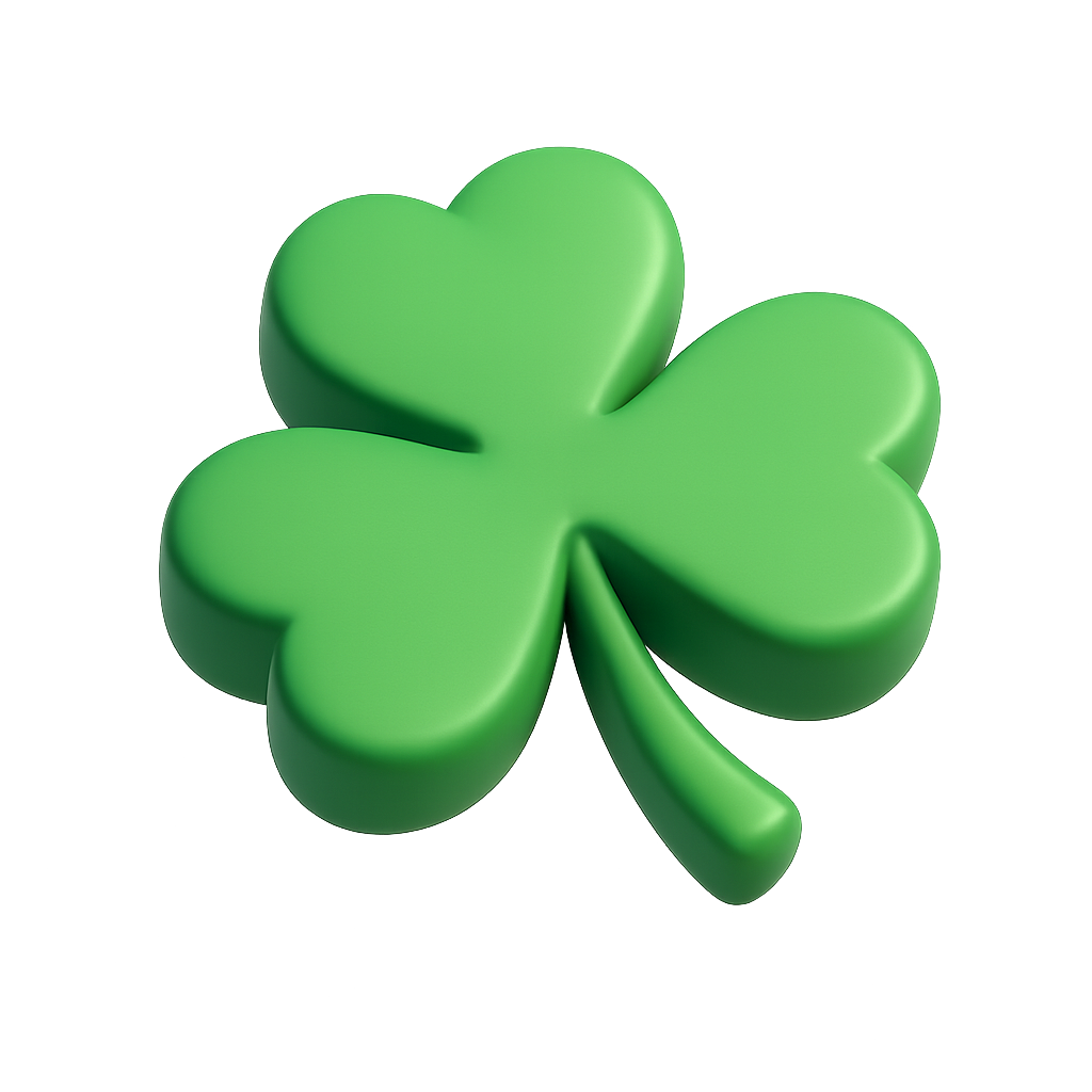 A vibrant, three-dimensional clover icon featuring a three-leaf design. The icon has a glossy green surface and is presented in a three-quarter view, creating a volumetric effect.