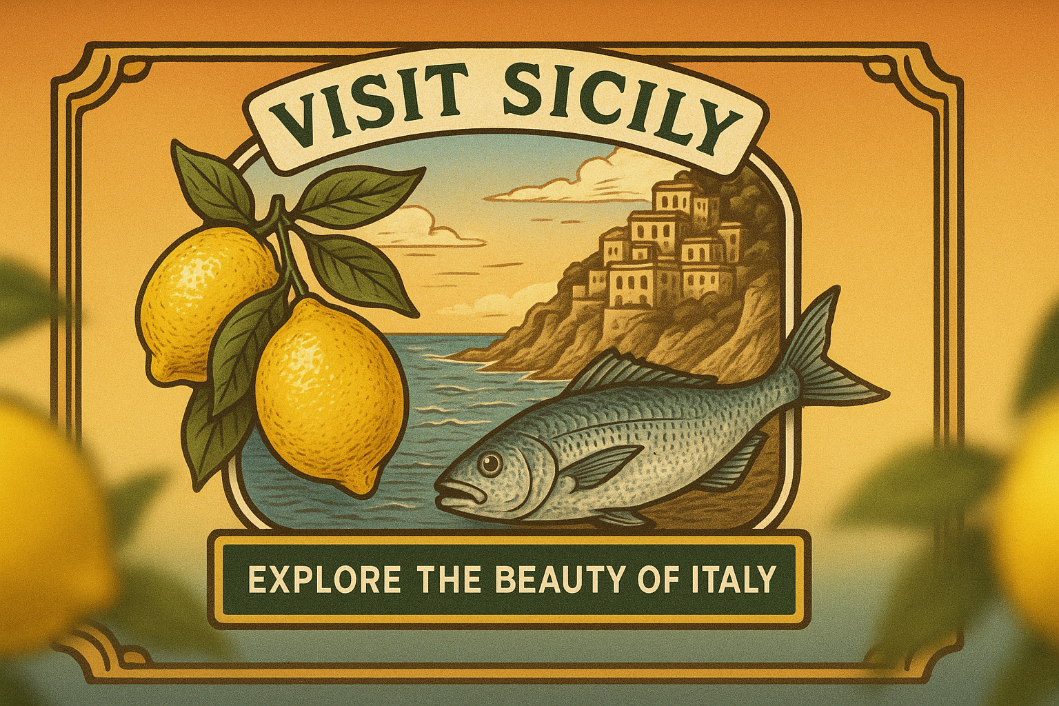 /Collection: /by davooda/Type: PNG/Charming vintage-style travel poster featuring iconic Sicilian elements like lemons and a coastal village, ideal for tourism promotion and travel marketing.
