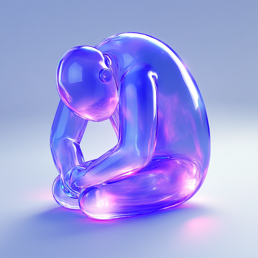 /Collection: /by davooda/Type: PNG/A modern, translucent glass sculpture depicting a seated figure in a contemplative pose. The vibrant purple and blue hues create a serene atmosphere, ideal for art galleries or contemporary decor.