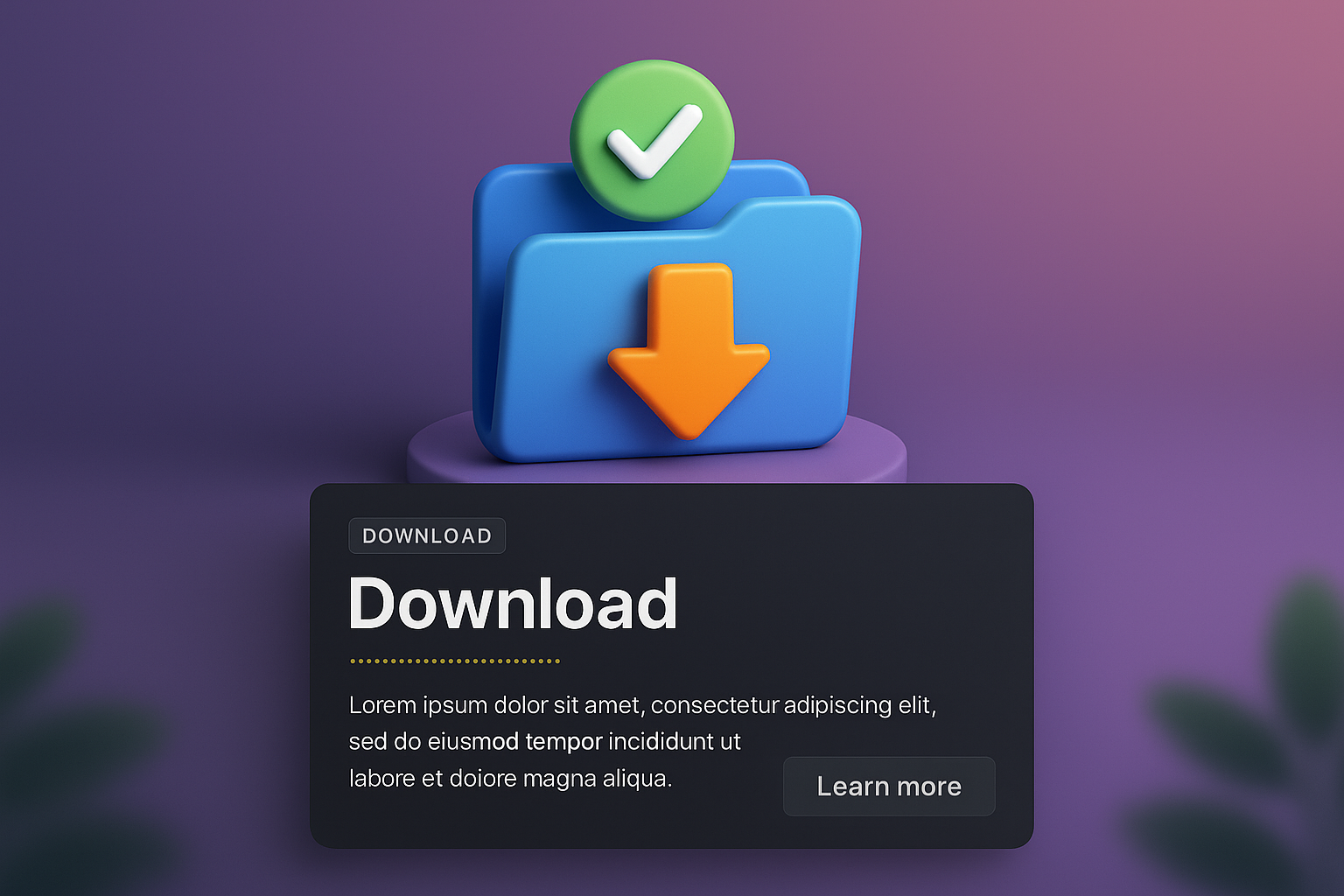A visually appealing 3D illustration featuring a download icon with a checkmark. The design includes a dark banner with descriptive text and a call to action, set against a smooth gradient background.