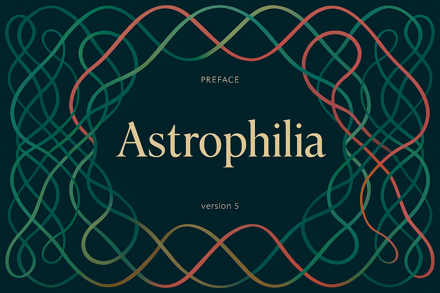 This image showcases an elegant design featuring colorful intertwining patterns surrounding the word 'Astrophilia' in a sophisticated font, set against a dark background.