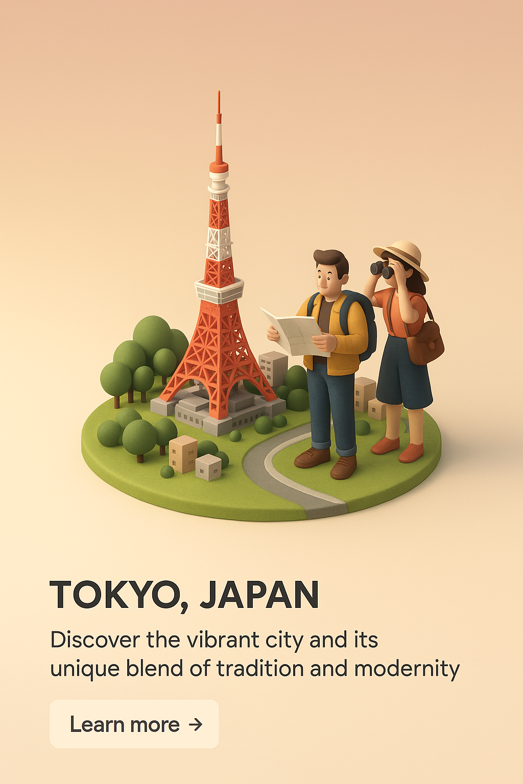 A charming 3D illustration showcasing Tokyo's iconic tower with tourists, emphasizing the city's blend of tradition and modernity in a vibrant scene.