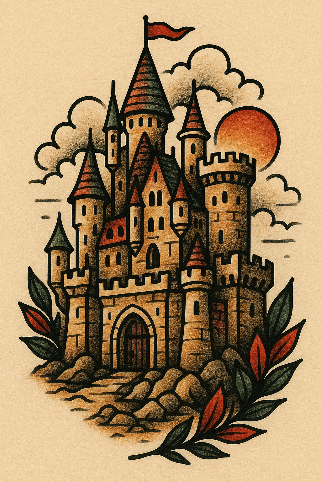 A beautifully illustrated castle surrounded by stylized clouds and foliage, ideal for art prints or fantasy-themed projects. The design features bold lines and a vintage color palette.
