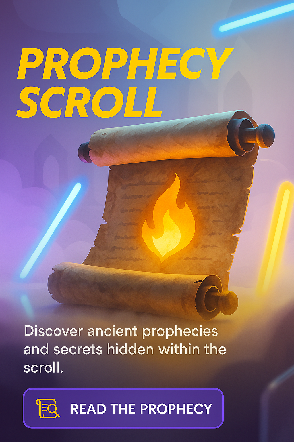 A visually engaging carousel slide featuring a glowing prophecy scroll with neon accents. The design highlights ancient prophecies with vibrant colors, including deep violet and carrot yellow.