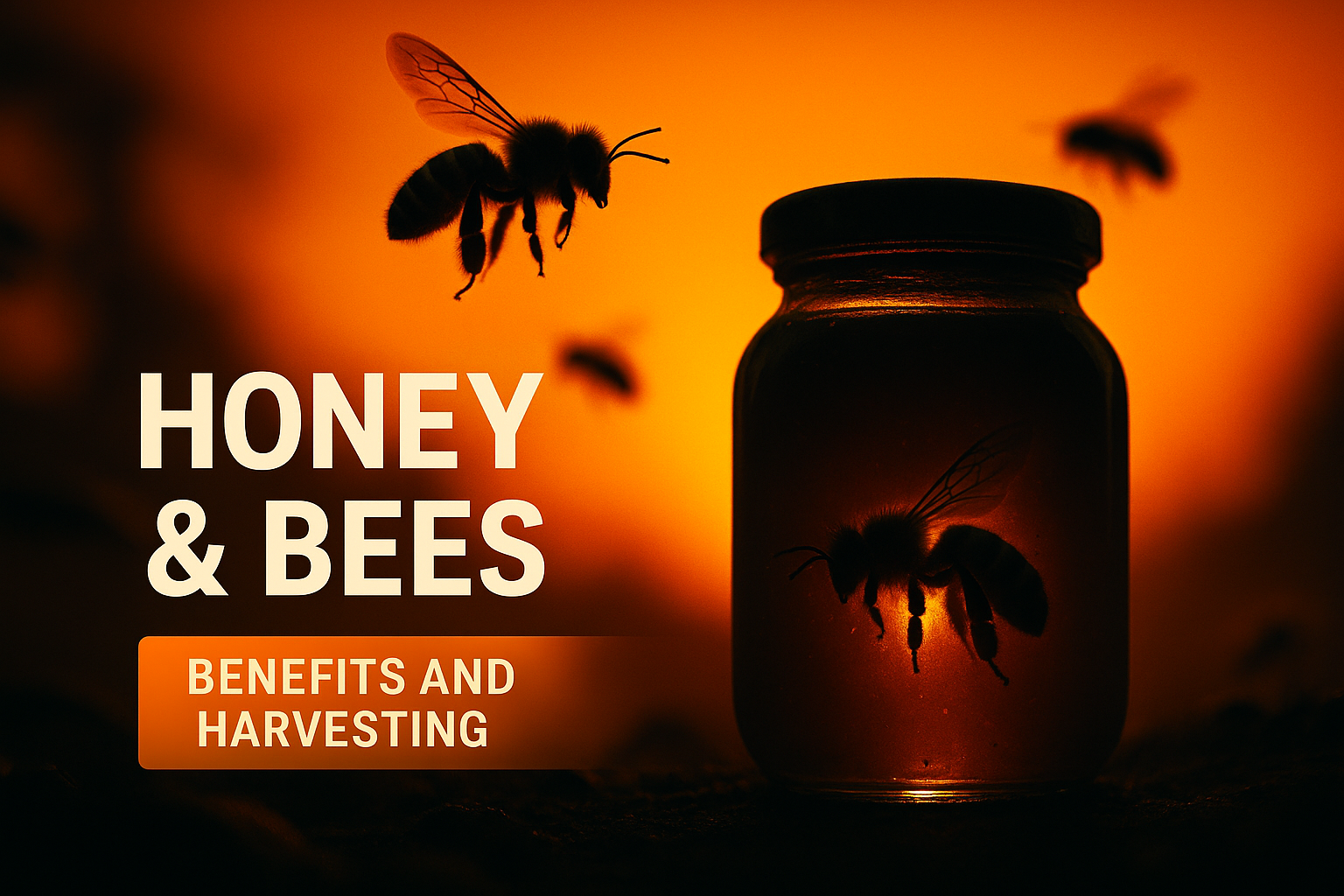 /Collection: /by davooda/Type: PNG/This graphic highlights the theme of honey and bee harvesting, featuring a jar illuminated by a warm, orange background. Ideal for educational or promotional use.