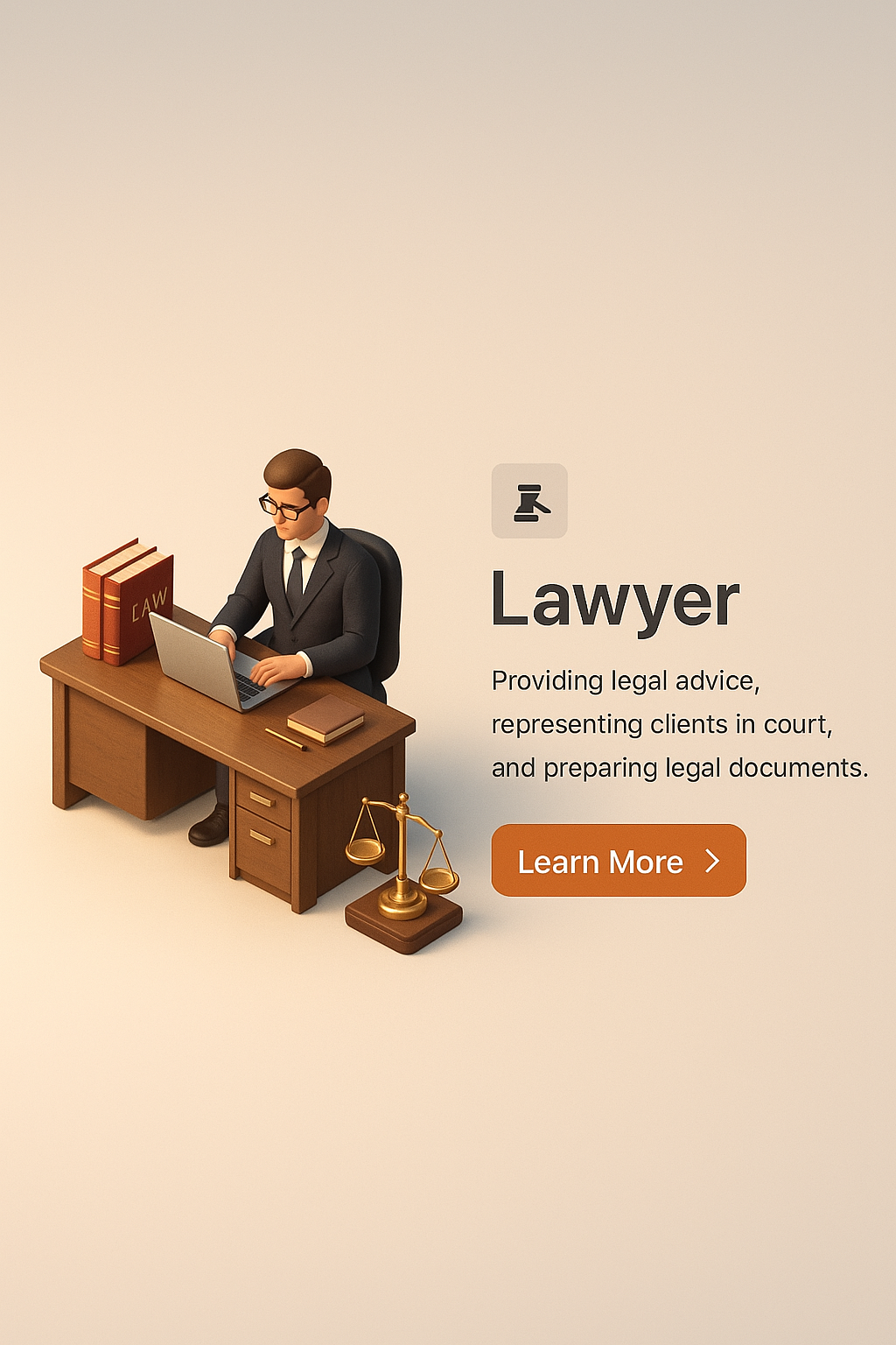 A 3D illustration depicting a lawyer at a desk, surrounded by legal books and a scale of justice, with a soft gradient background and a call-to-action button.