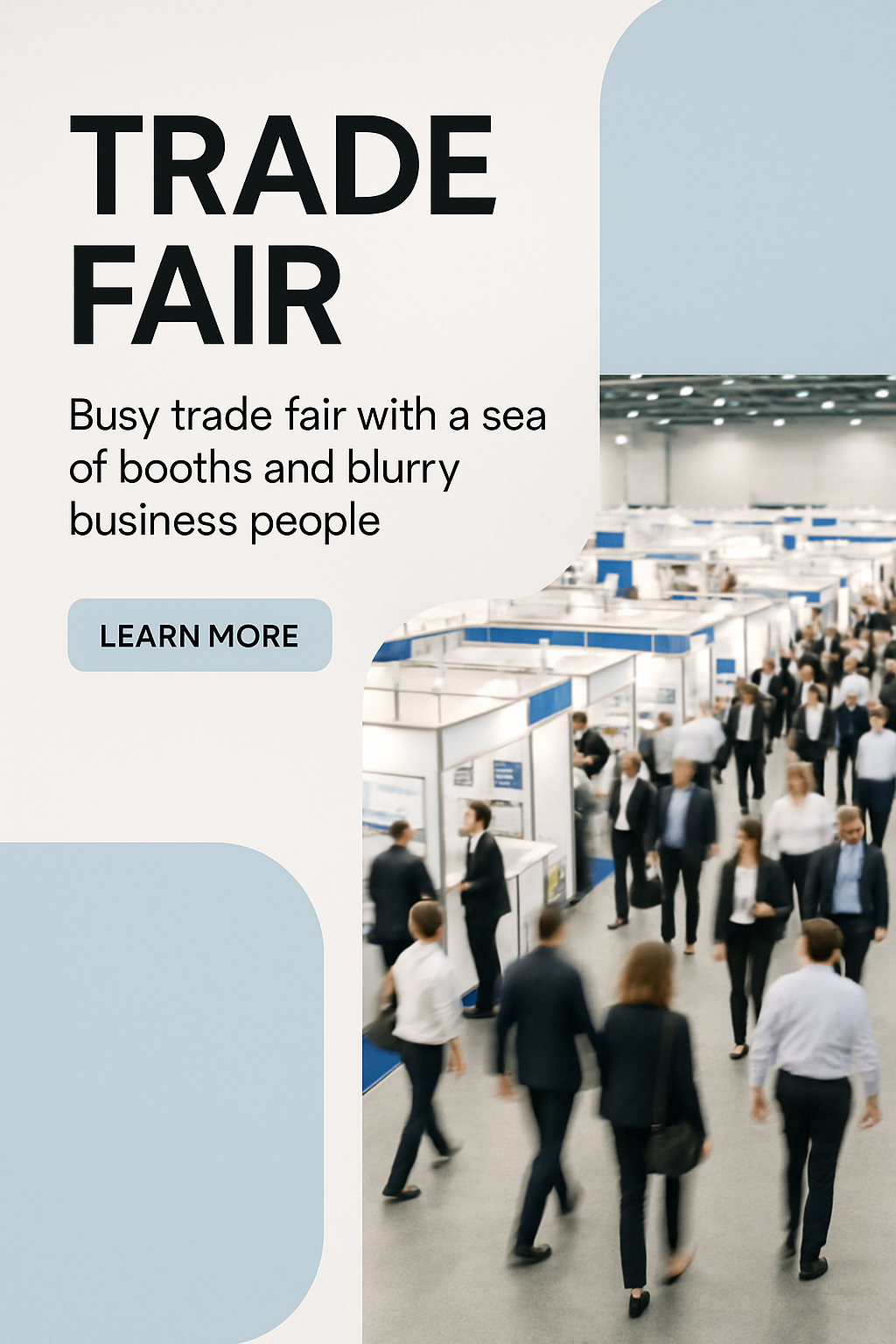 /Collection: /by davooda/Type: PNG/A vibrant trade fair scene captures a bustling atmosphere filled with booths and blurred figures of business professionals. The layout features modern typography and emphasizes clarity.