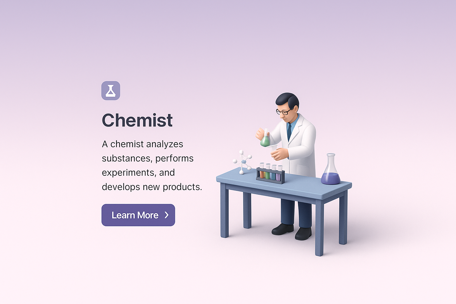 /Collection: /by davooda/Type: PNG/A detailed 3D scene portraying a chemist at work in a laboratory setting. The chemist analyzes substances, surrounded by various lab equipment, with a smooth gradient background.