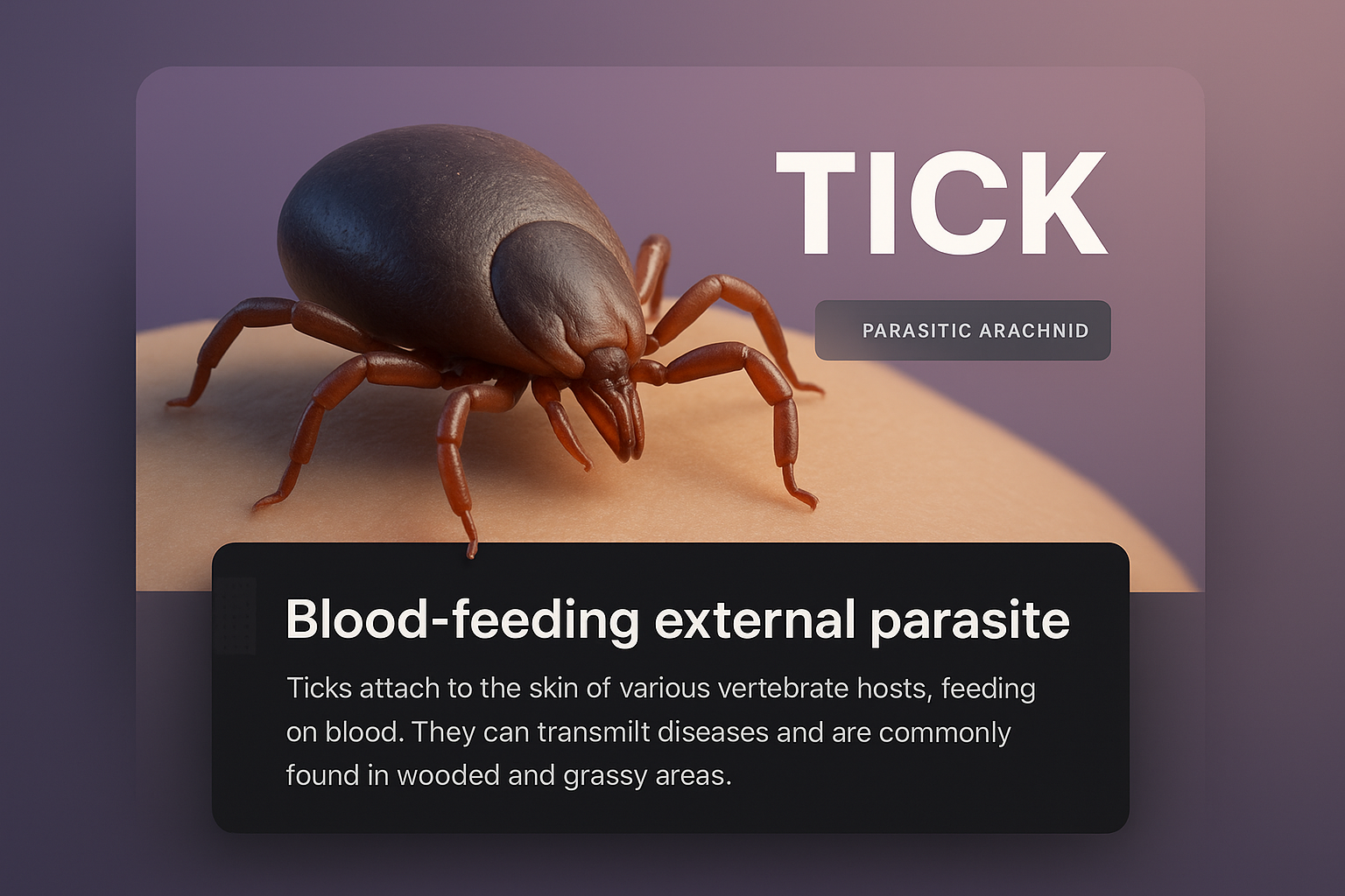 /Collection: /by davooda/Type: PNG/A realistic 3D rendering of a tick, featuring informative text boxes and a cohesive dark-themed layout. The design incorporates depth with blurred elements and a gradient background.