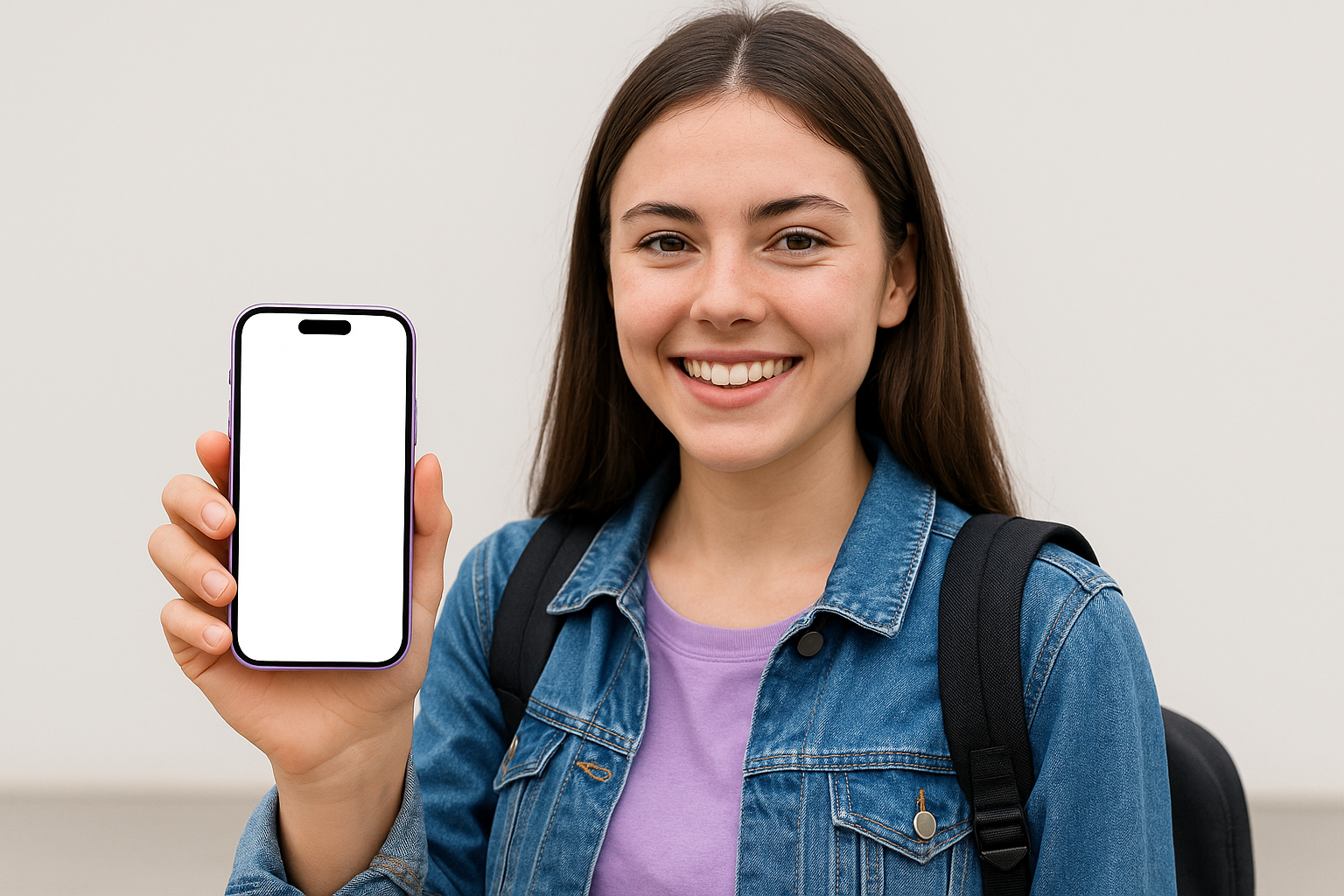 A young female student is smiling while holding a purple smartphone with a blank screen. She wears a denim jacket and has a backpack, set against a neutral background.