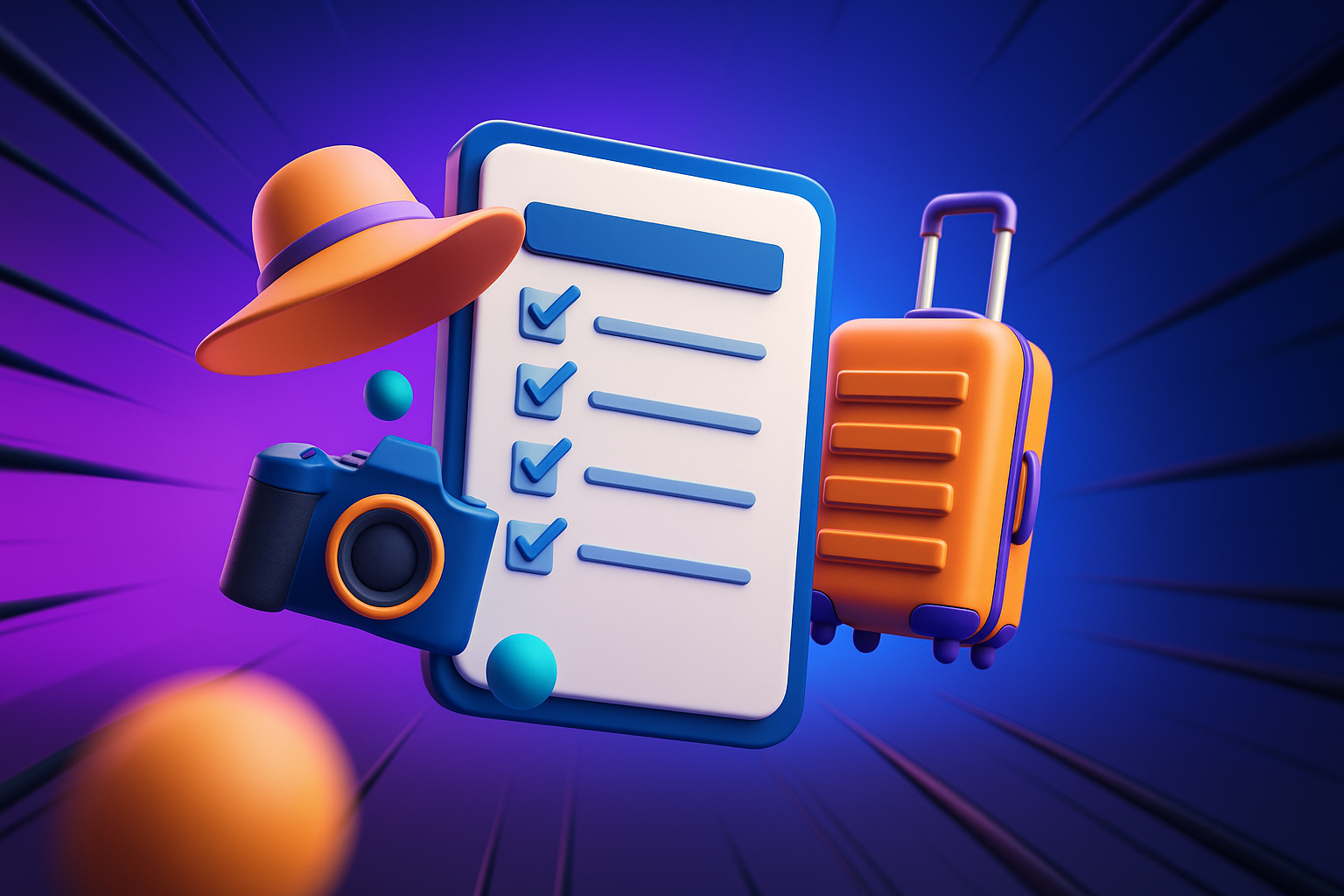 A vibrant 3D illustration of a travel packing list featuring a suitcase, camera, and hat. The dynamic background enhances the sense of movement and excitement.