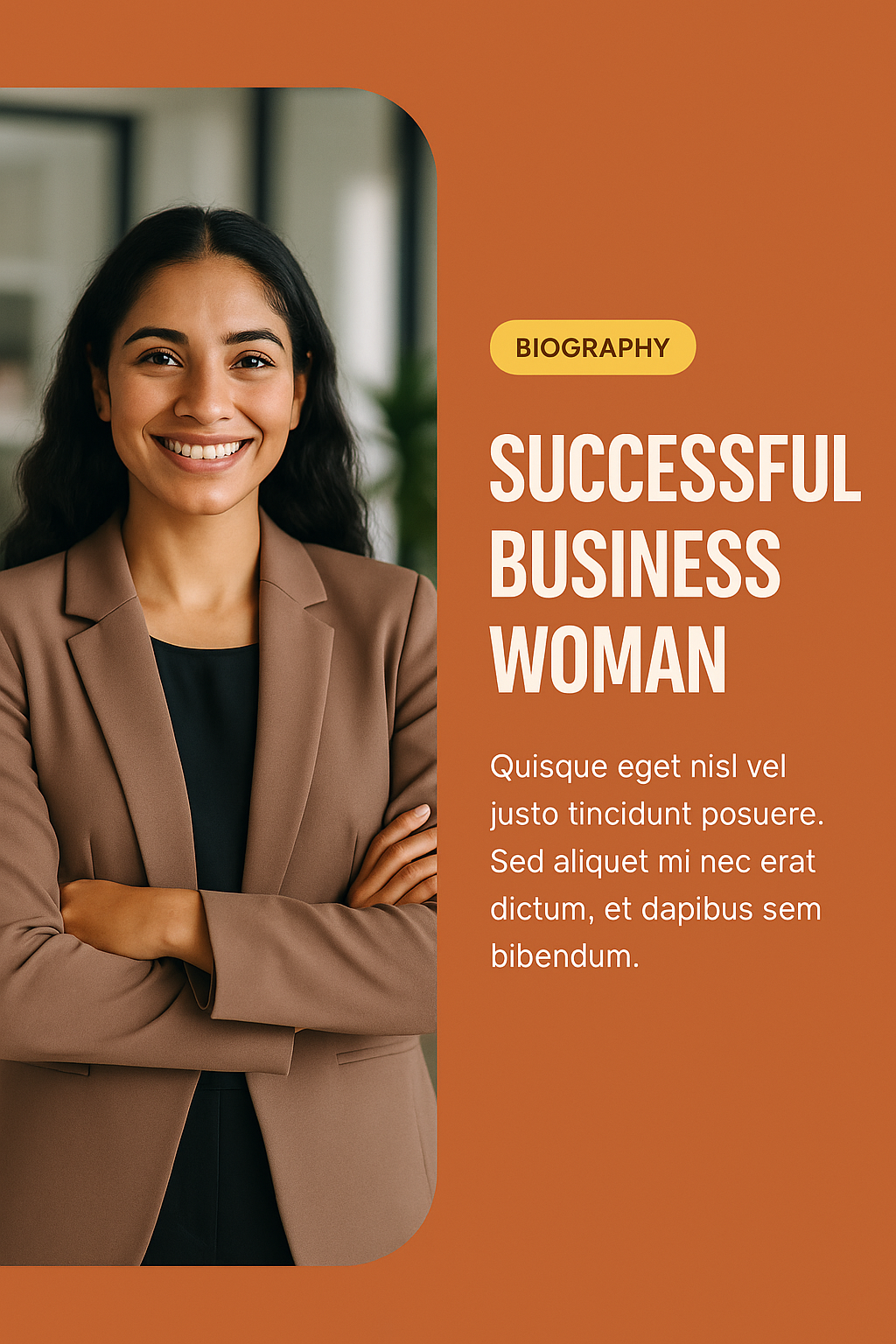 /Collection: /by davooda/Type: PNG/A modern biography graphic showcasing a successful business woman, ideal for profiles or personal branding. The design combines warm colors with a professional portrait, enhancing the subject's appeal.