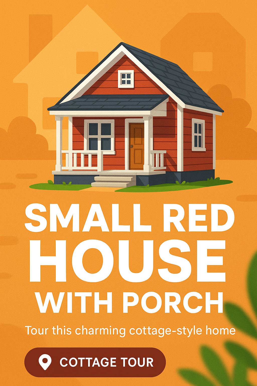 /Collection: /by davooda/Type: PNG/A colorful illustration of a small red cottage with a porch, designed for promoting a house tour. The graphic uses a warm color palette and inviting design elements.