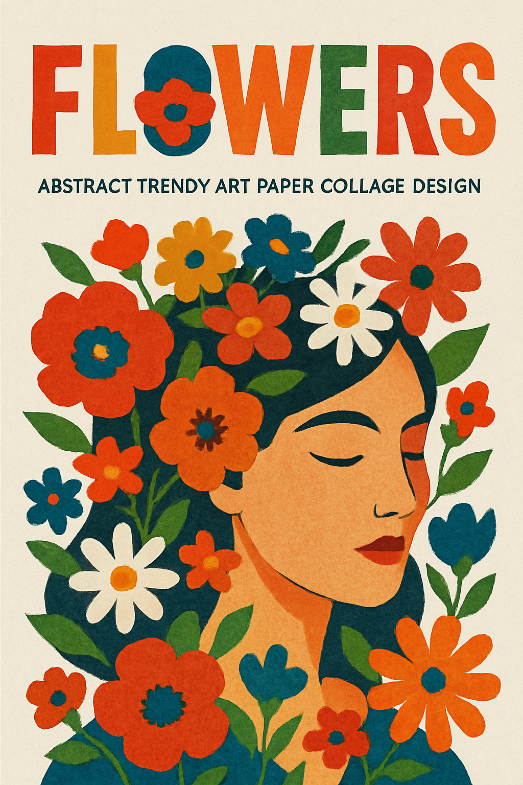 Creative paper collage design featuring a woman surrounded by colorful flowers, ideal for art prints or decor, showcasing a trendy modern aesthetic.