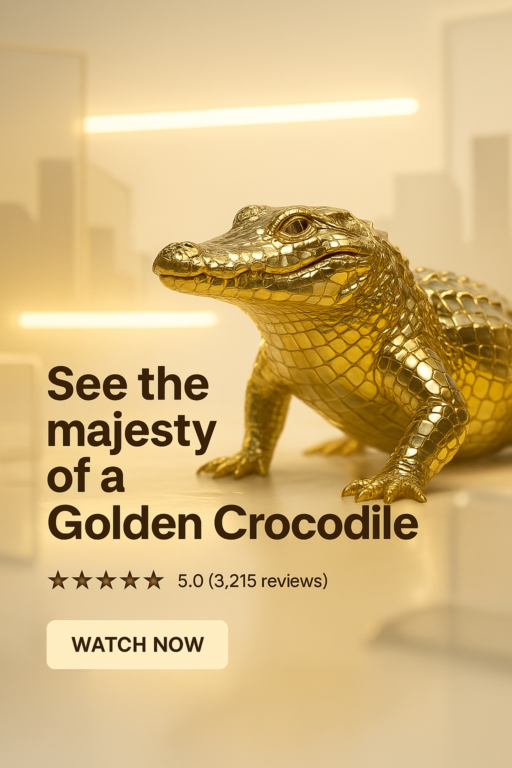 A sleek promotional graphic featuring a golden crocodile sculpture. The design is modern and minimalistic, aimed at attracting viewers to a unique experience or product.