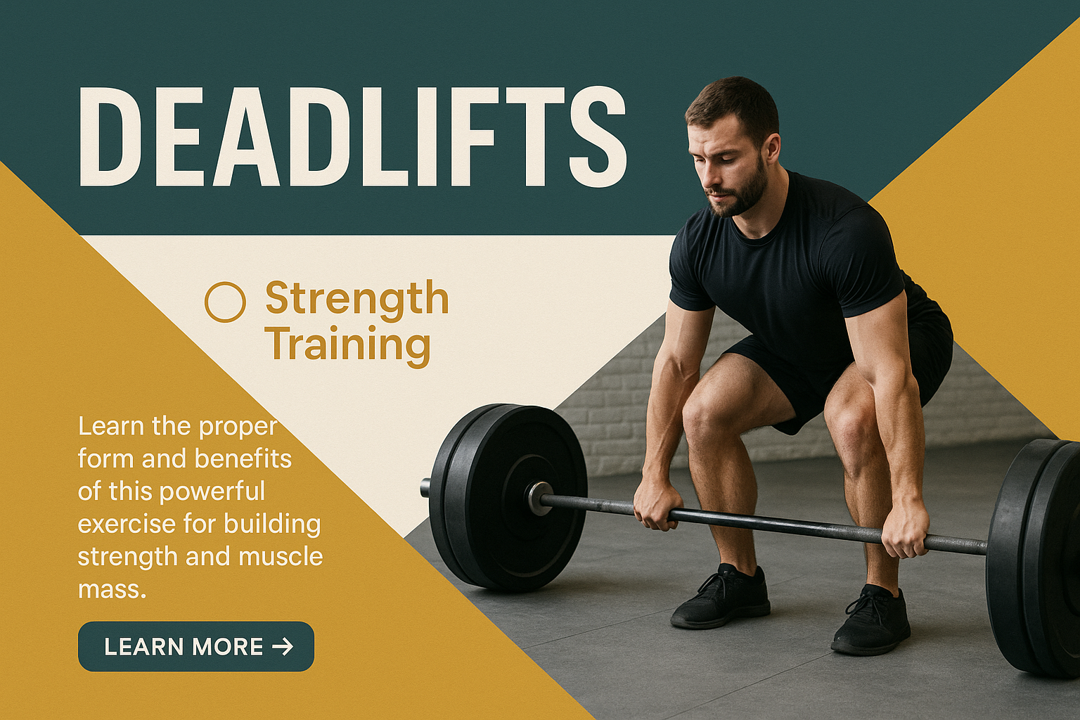 An engaging and professional design featuring a man performing deadlifts, highlighting strength training. The layout includes contrasting colors, a clear hierarchy, and a call-to-action button.