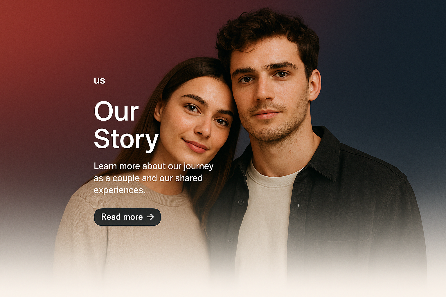 A web design concept showcasing a couple with a gradient background. The layout includes a small label, a brief headline, and a text block next to an action button.