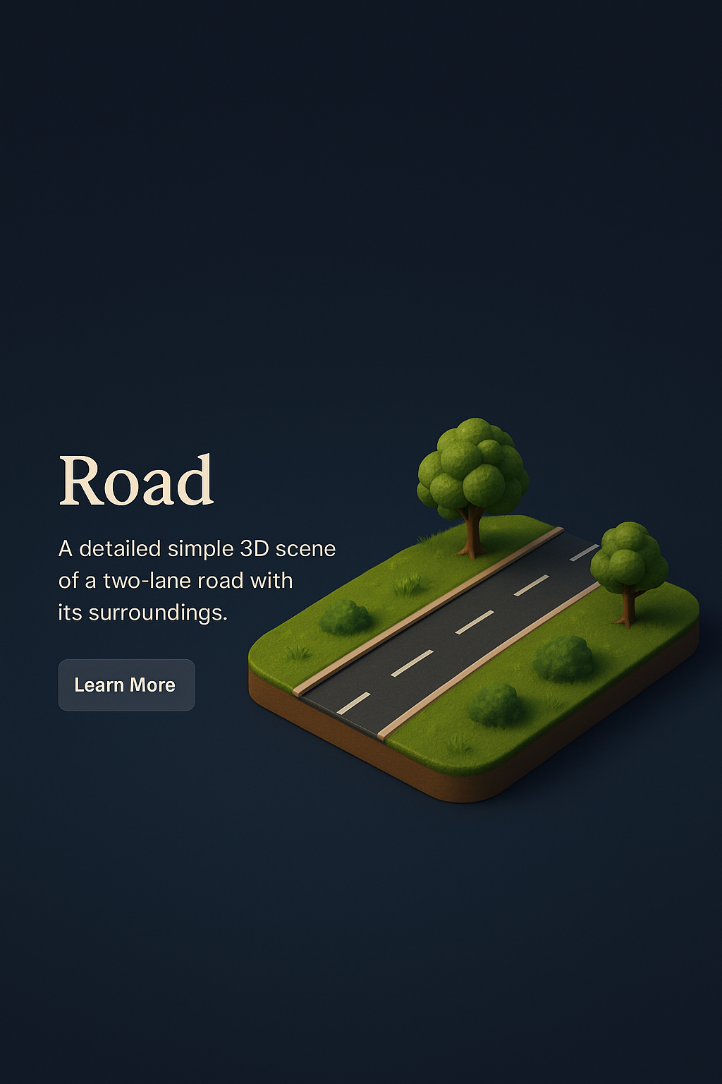 This image features a detailed 3D representation of a two-lane road with lush green trees, set against a dark gradient background, creating a serene and realistic atmosphere.