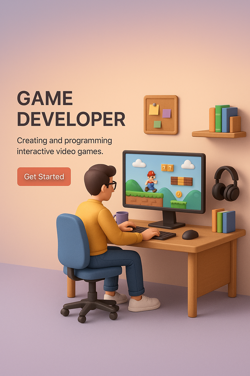 A detailed 3D illustration depicting a game developer at a desk, programming interactive video games. The scene includes a computer, gaming elements, and a cozy workspace.