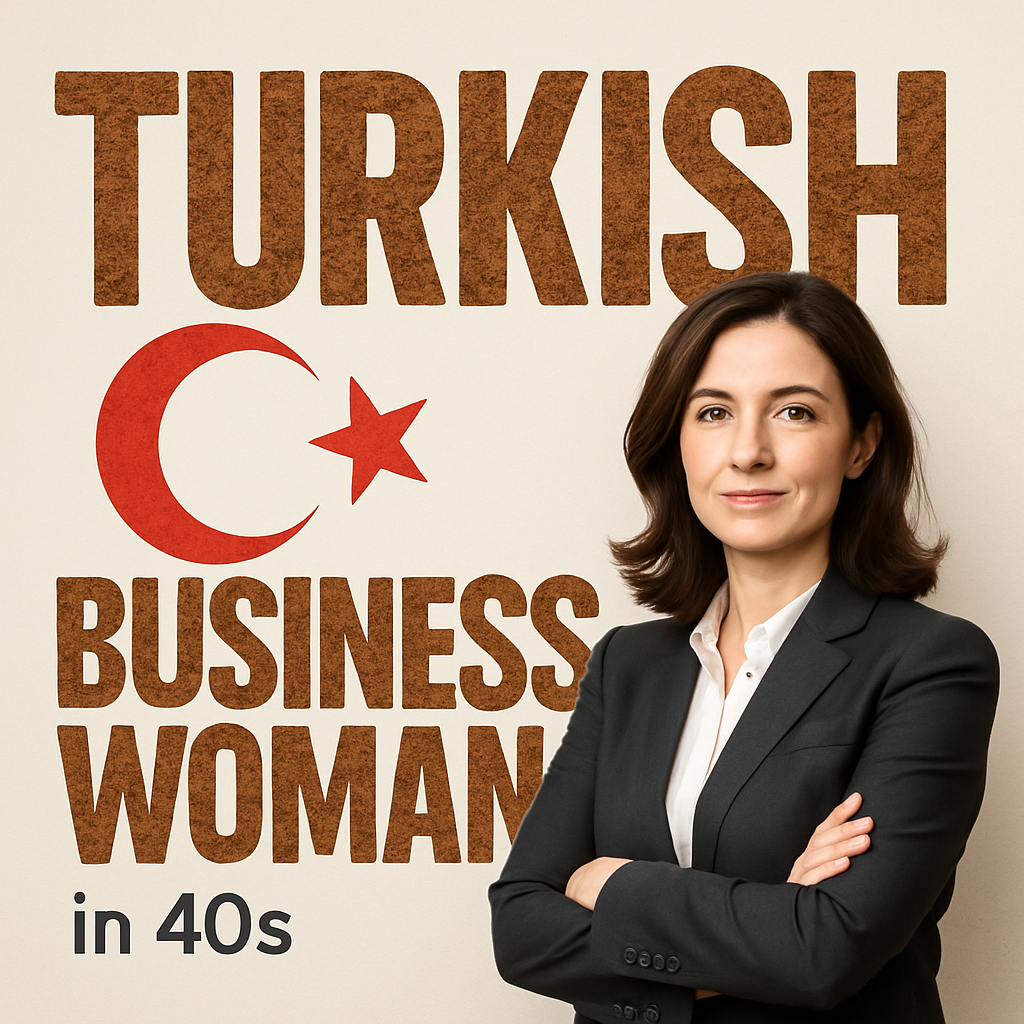 A professional portrait featuring a confident Turkish business woman in her 40s, set against a textured background. Ideal for articles on entrepreneurship and women's leadership.