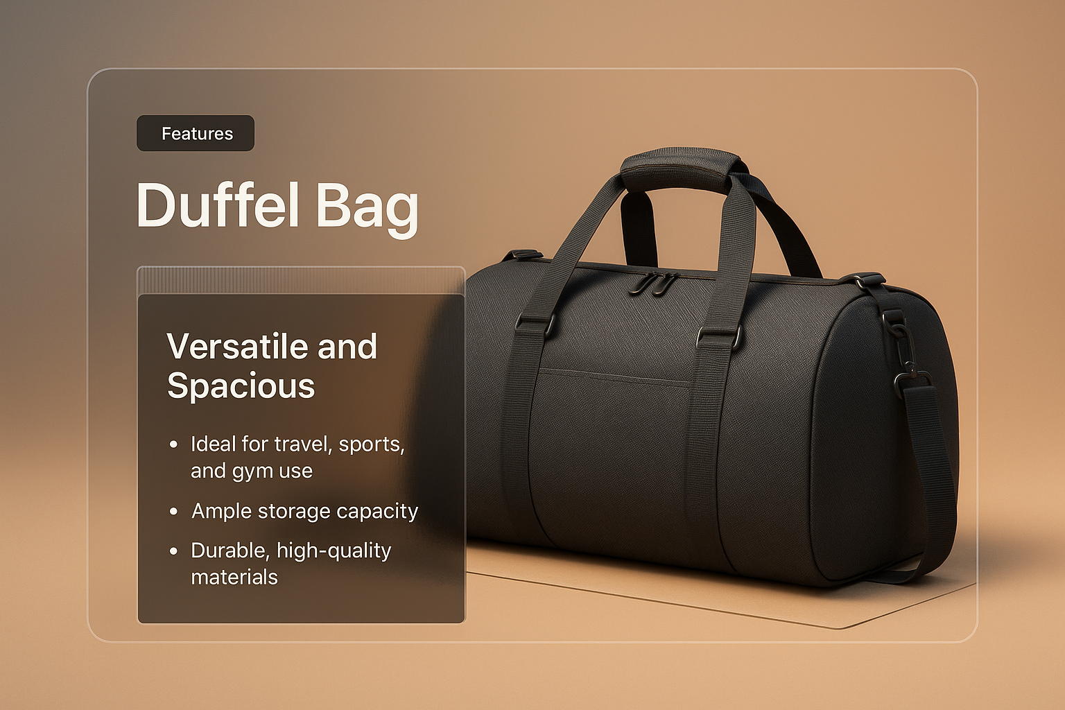 A 3D illustration of a sleek black duffel bag, showcasing its spacious design and durable materials. Features highlighted in a modern, transparent display.
