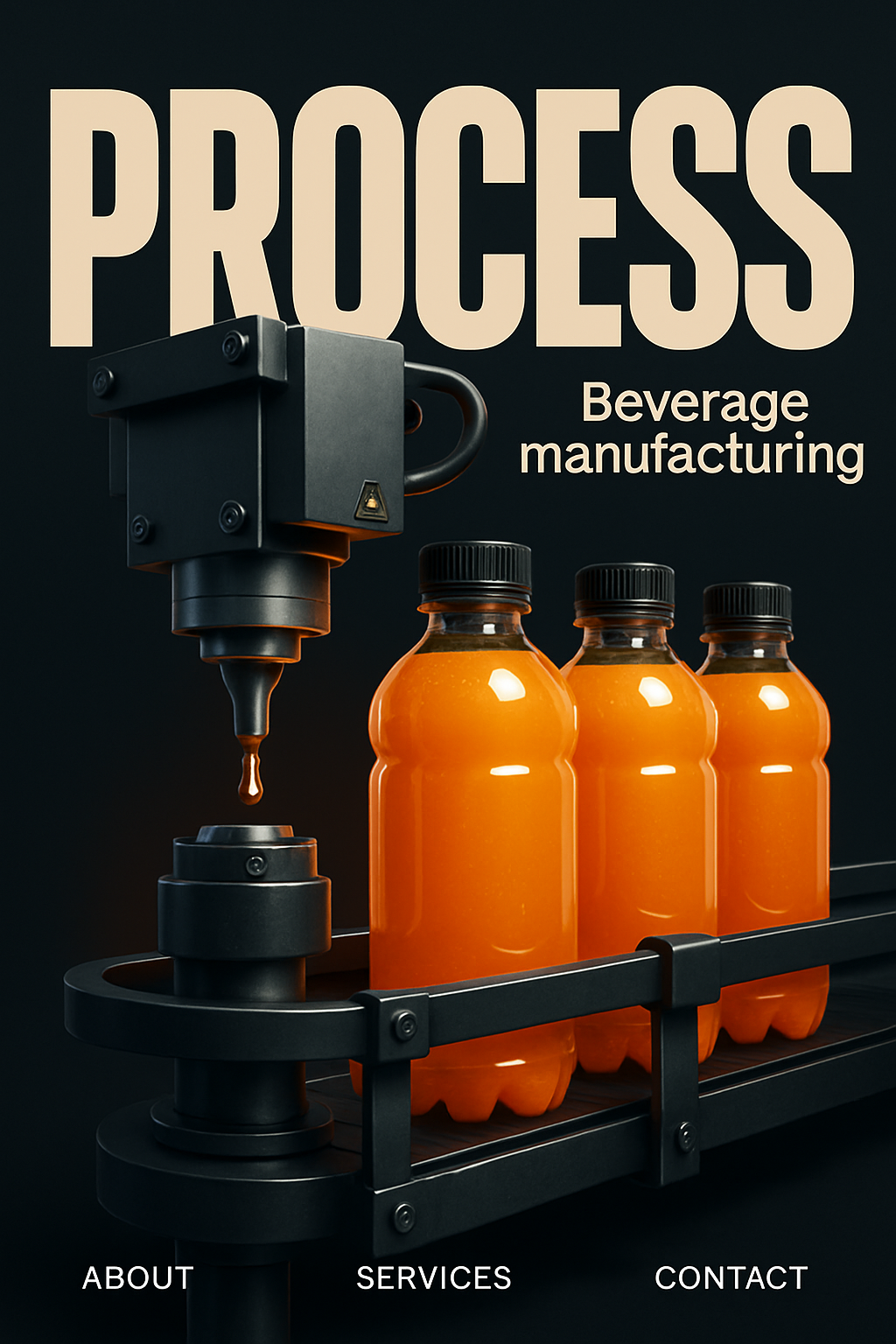 A dramatic scene of beverage manufacturing featuring a conveyor belt with bottles. A modern machine dispenses liquid into the bottles, showcasing a blend of realism and minimalistic design.