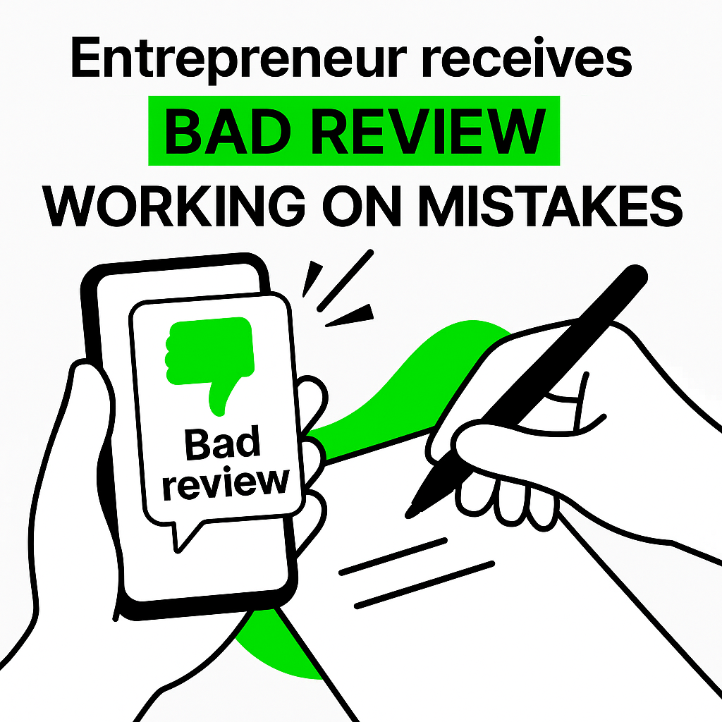 /Collection: /by davooda/Type: PNG/A graphic illustrating an entrepreneur's response to a bad review, featuring a smartphone and handwritten notes. Designed for social media engagement and discussion on customer feedback.