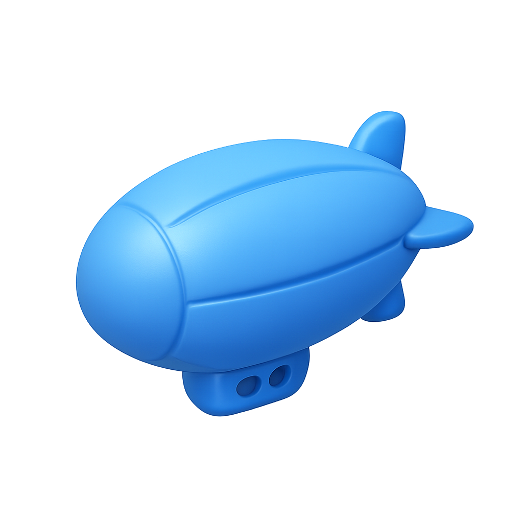 A vibrant blue 3D blimp icon displayed in a three-quarter isometric view. The design features smooth, rounded shapes and a glossy finish, creating a volumetric appearance against a subtle gradient background.