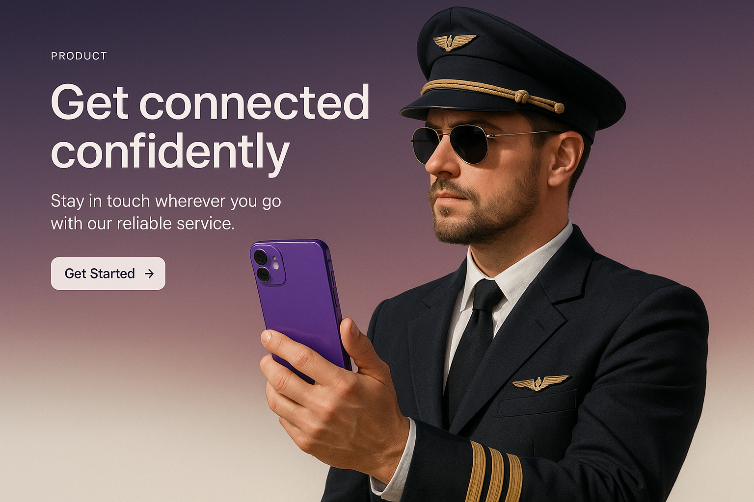 A pilot in a uniform holds a purple phone confidently, set against a gradient background. The design emphasizes clarity and modern communication.