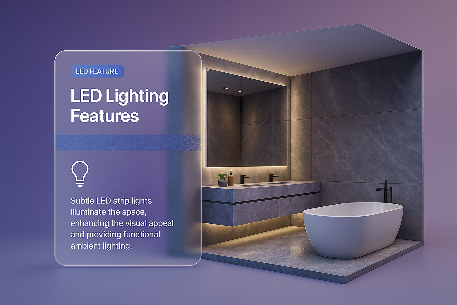 A modern bathroom showcasing sleek grey marble, featuring LED strip lighting, a double vanity, and a freestanding tub, creating a stylish ambiance.