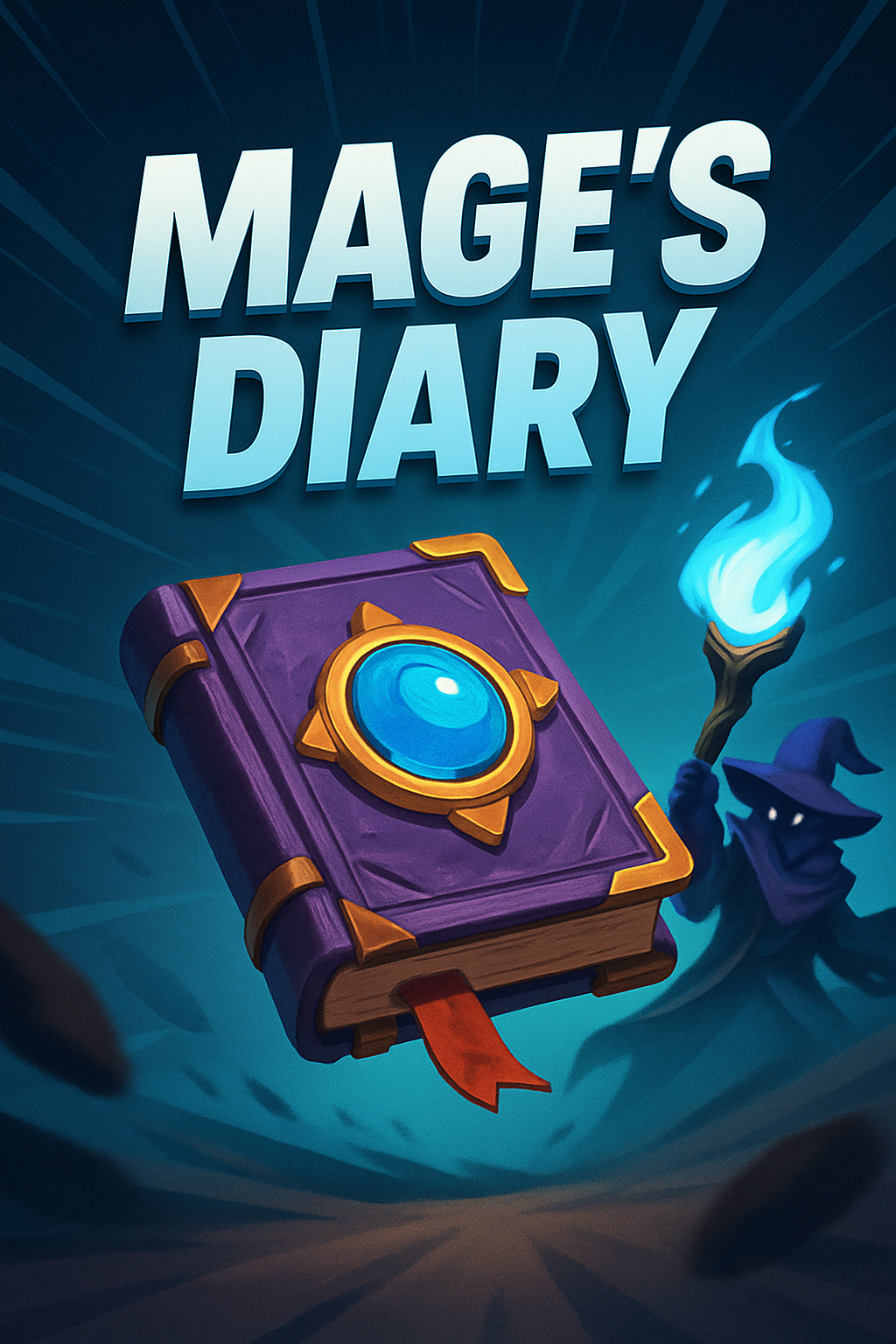 /Collection: /by davooda/Type: PNG/The image features a mystical mage's diary with a glowing blue gem, surrounded by dynamic lines and a shadowy figure wielding magic. The color palette is engaging and professional.
