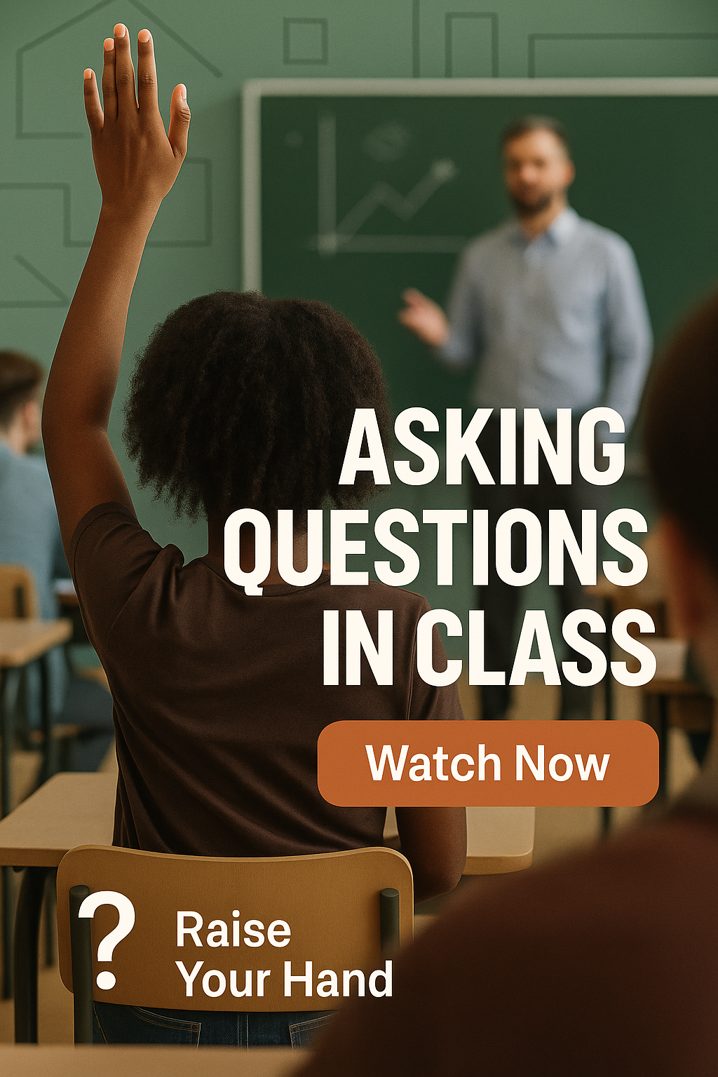 /Collection: /by davooda/Type: PNG/Engaging social media post featuring a student raising their hand in class, promoting the importance of asking questions. Ideal for educational platforms.