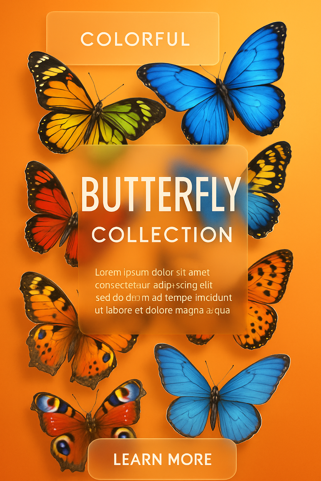 /Collection: /by davooda/Type: PNG/A stunning showcase of various butterfly species against a vibrant gradient background. The design features layered glass panels with text, creating a modern, editorial look.