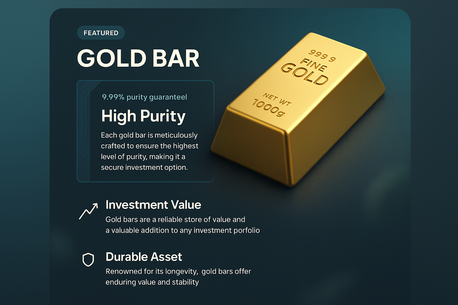 /Collection: /by davooda/Type: PNG/A detailed 3D illustration of a gold bar, designed with informative text blocks highlighting its features, investment value, and durability. The background features a smooth gradient.