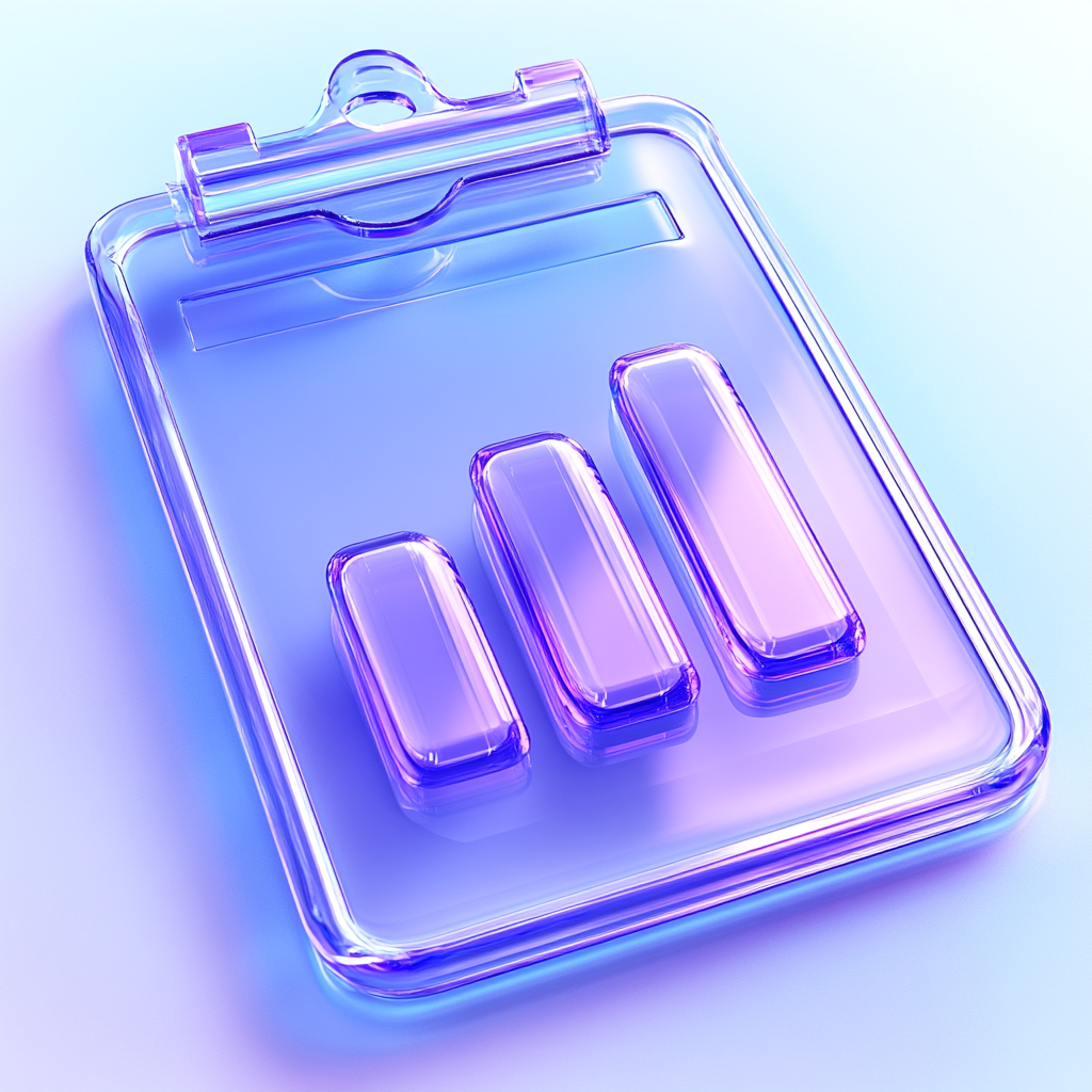 A modern, stylized graphic of a clipboard featuring three data bars, designed in a sleek, translucent style. Ideal for presentations or digital reports.