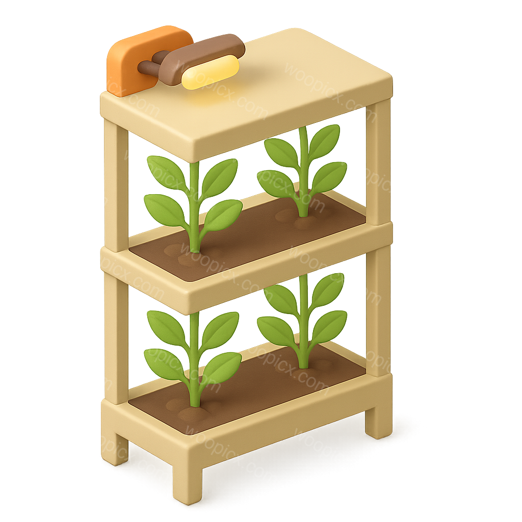A 3D icon of vertical farming featuring a tiered shelf with lush green plants growing in soil. The design is isometric with a volumetric feel, showcasing a modern farming concept.
