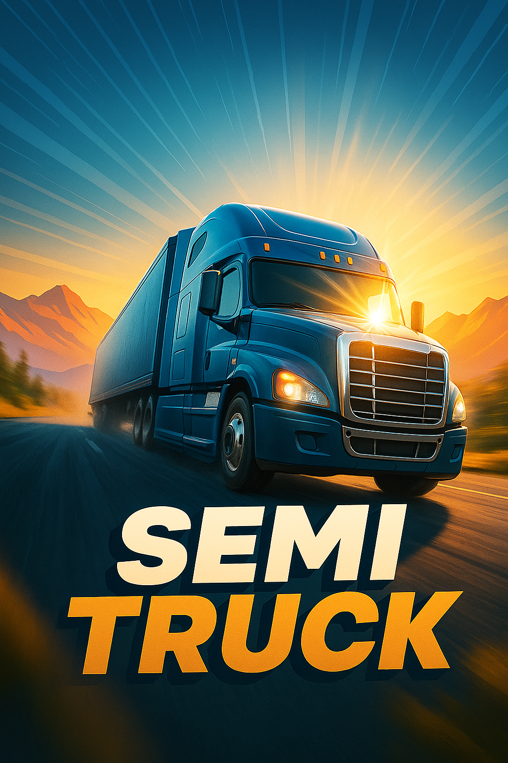 A vibrant blue semi truck drives along a winding road with majestic mountains in the backdrop, illuminated by the warm glow of a sunset. The scene is dynamic, capturing motion and energy.