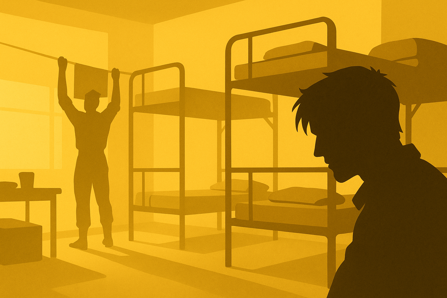 /Collection: /by davooda/Type: PNG/A minimalist silhouette illustration depicting a dormitory with bunk beds. The warm yellow hues create a nostalgic atmosphere, suitable for themes related to youth, community living, or military settings.