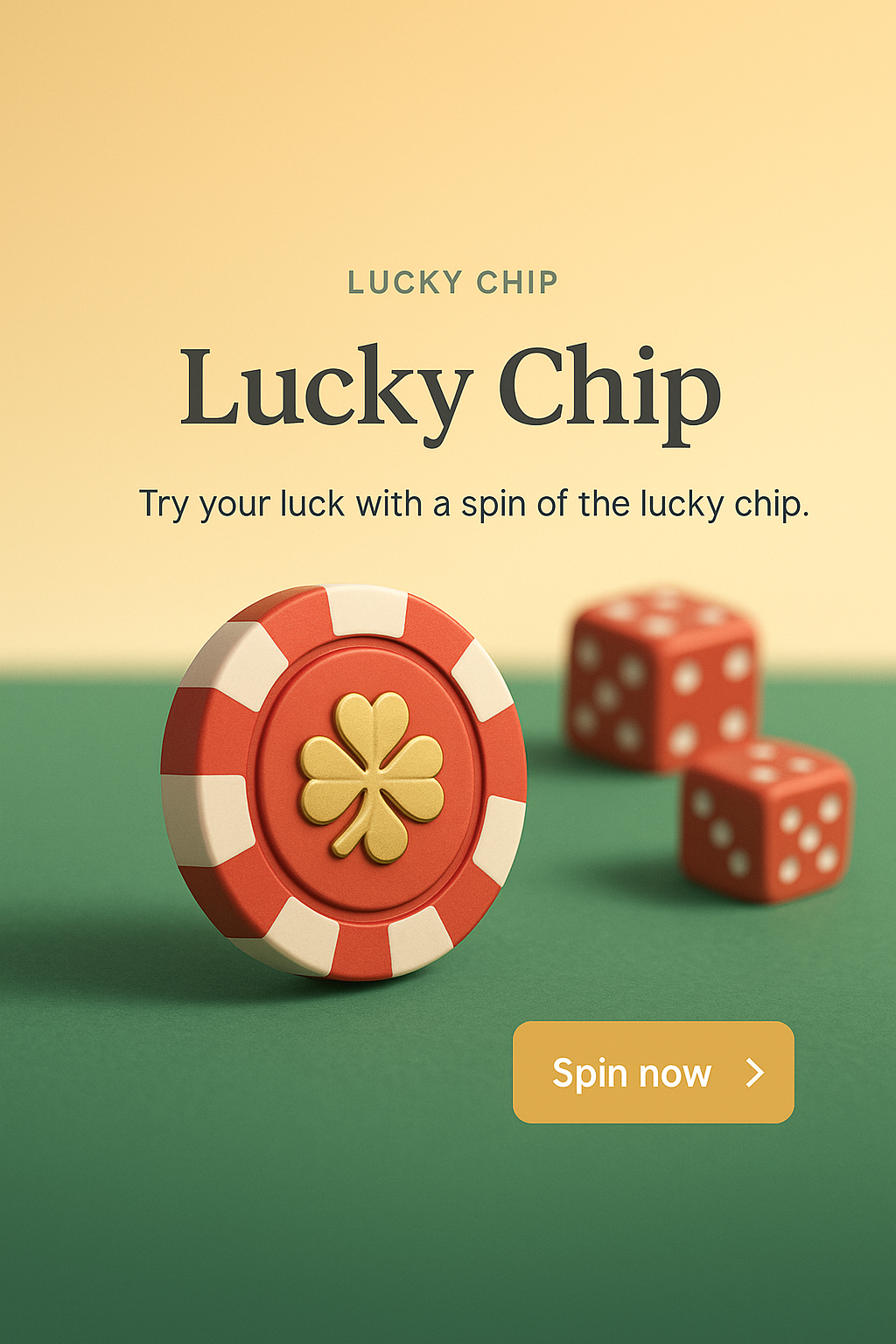 /Collection: /by davooda/Type: PNG/A realistic 3D illustration featuring a lucky chip and dice on a smooth gradient background. The chip is prominently displayed with text suggesting a gaming action.