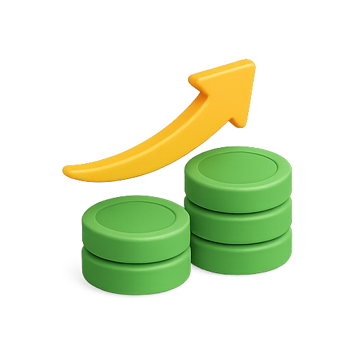 /Collection: /by davooda/Type: PNG/A modern 3D icon depicting stacks of green coins with a yellow upward arrow, symbolizing financial growth and investment. Ideal for financial services marketing and educational content.
