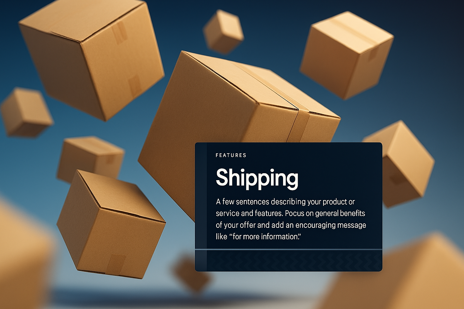 A visually striking 3D illustration featuring various cardboard boxes floating against a smooth gradient background. The scene includes a text block highlighting shipping features.