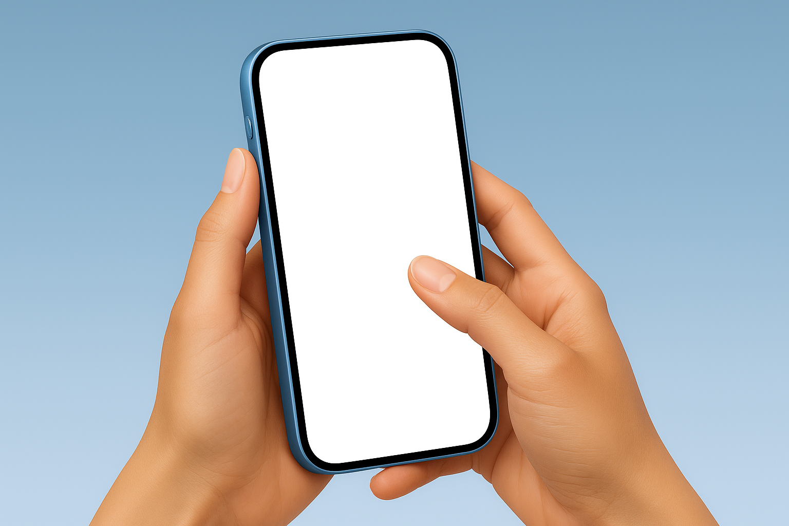 Blank Phone Screen Held in Hand Against Blue Background
