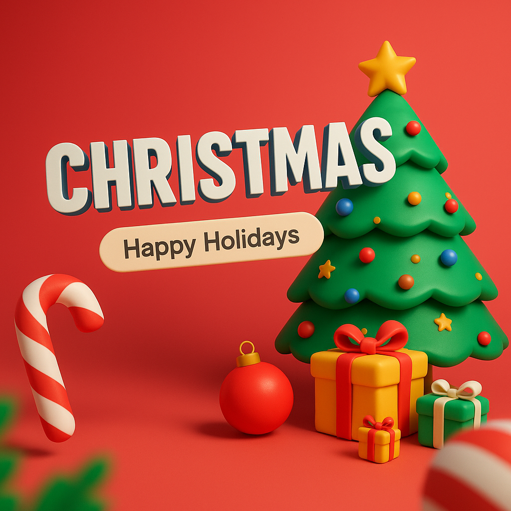 A vibrant 3D graphic featuring a Christmas tree, gifts, and holiday decorations, ideal for festive promotions and social media posts.