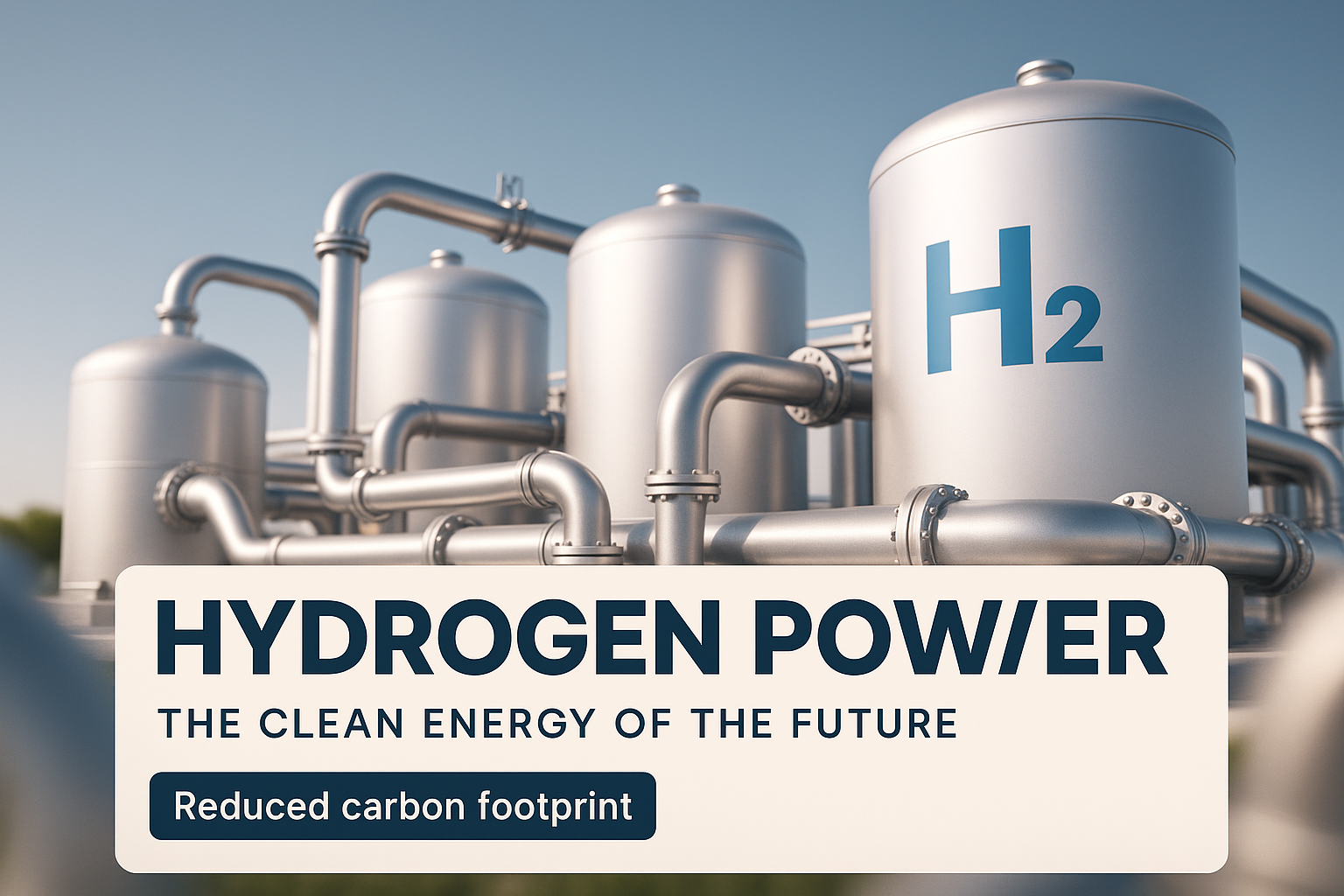 A wide-angle view of a hydrogen power plant showcasing large steel tanks and pipes. The image emphasizes the clean energy concept with clear visuals of H2 technology.