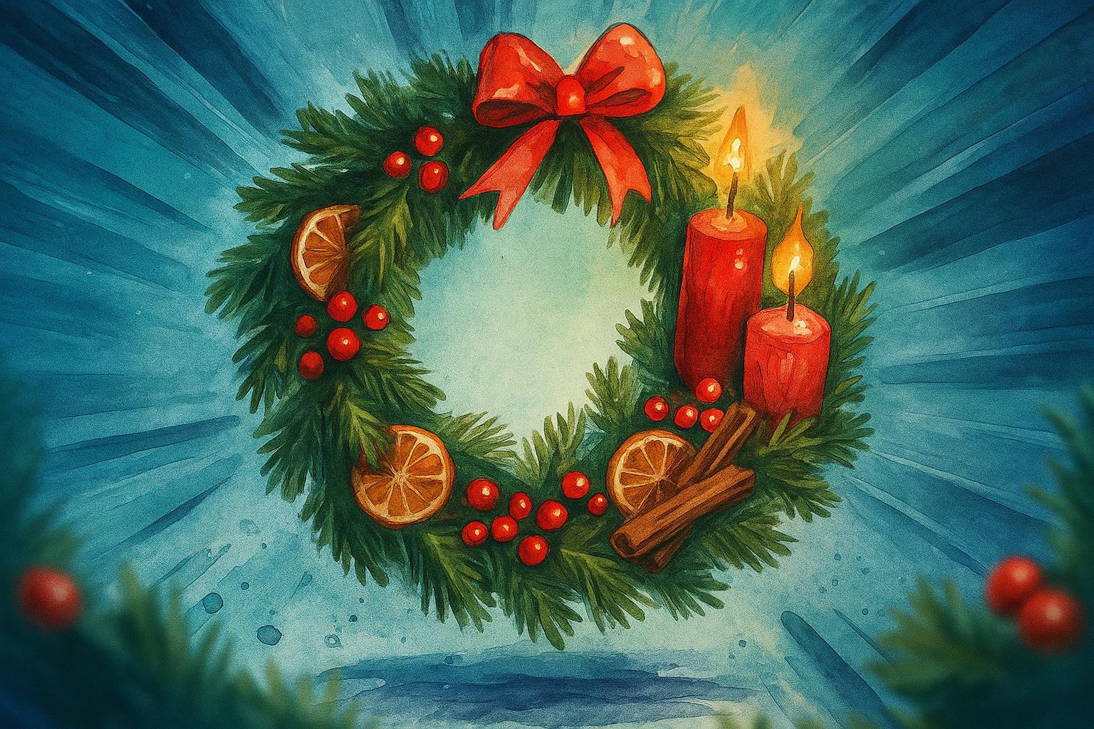 A beautifully illustrated retro Christmas wreath featuring candles, oranges, and red berries, set against a dynamic blue background with radiant lines.