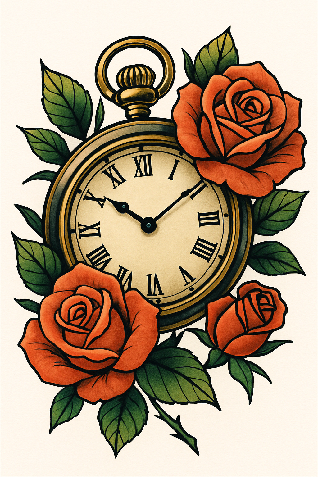 /Collection: /by davooda/Type: PNG/A beautifully illustrated design featuring a vintage pocket watch adorned with vibrant roses, showcasing a classic and romantic style ideal for tattoo art or decorative prints.
